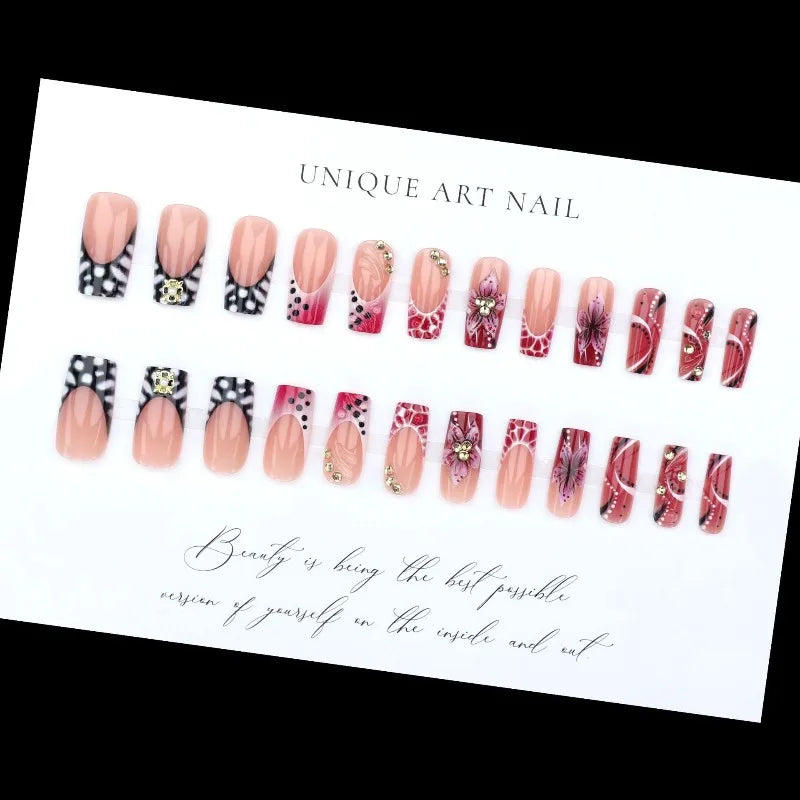 24pcs Pink Leopard Print Press on Nails Square False Nail Diamond Y2k Fake Nails French Polka Dots Nail 3D Flower Press on Nails